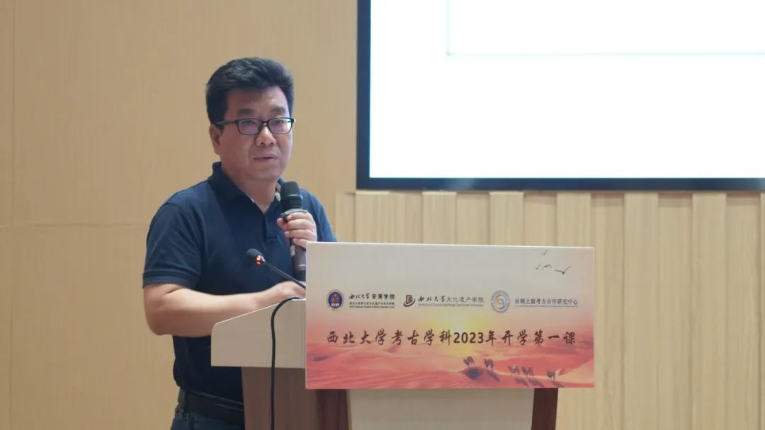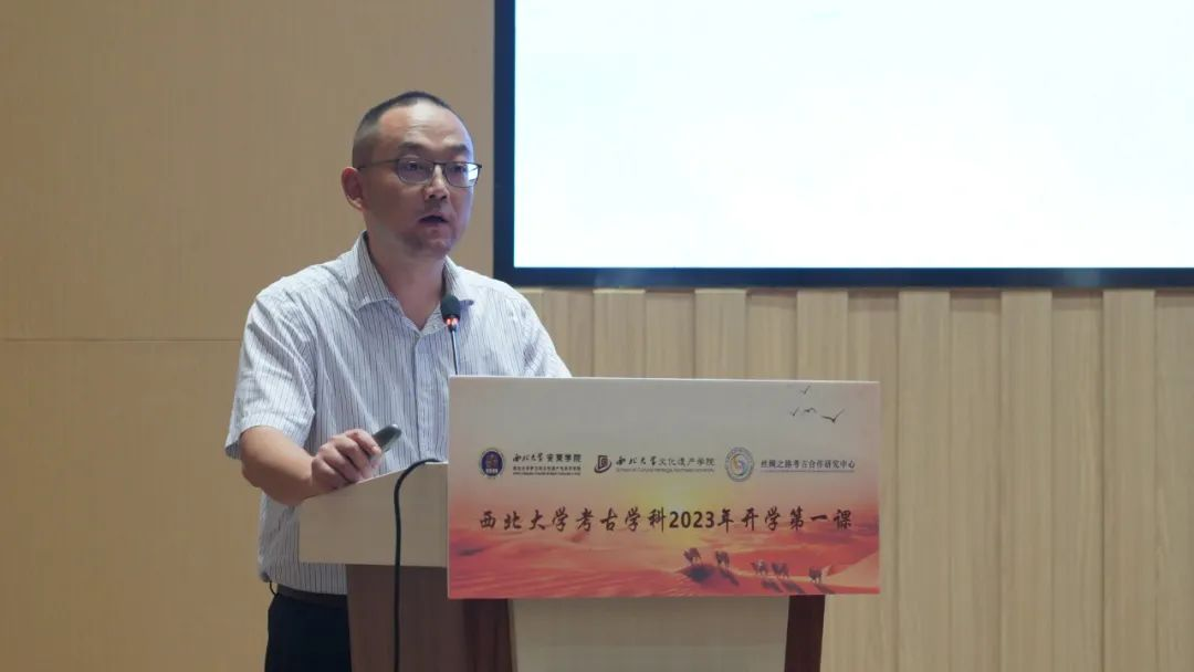 马健和孙周勇分别以“考古学——历史碎片的记忆拼图” “考古圣地、华章陕西”为题目讲授“开学第一课”。马健从“我们为什么需要考古学”“中国考古学的诞生和发展”和“西大考古创办发展历程和研究成果”三个方面进行讲授,围绕学科体系、组织架构、平台建设、人才培养等方面详细介绍了西大考古学科,并向2023级新生致以美好的祝愿。孙周勇围绕陕西考古博物馆人才结构、机构设施、人才荣誉等方面进行介绍,从探索未知揭示本源、建强体系创新方式、积极拓展国际合作、推动“两创”落实见效四个方面进行讲授,同时详细介绍了馆内陈设的“三大亮点”及“三大创新点”,并以发扬中国考古学先辈精神为切入点对新生提出了殷殷嘱托。