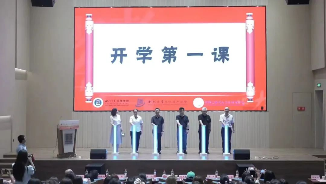 启动仪式上,李伟为西大考古学科2023级新生代表赠送书籍。与会领导和嘉宾共同按下启动键,为本次开学第一课正式拉开帷幕。
